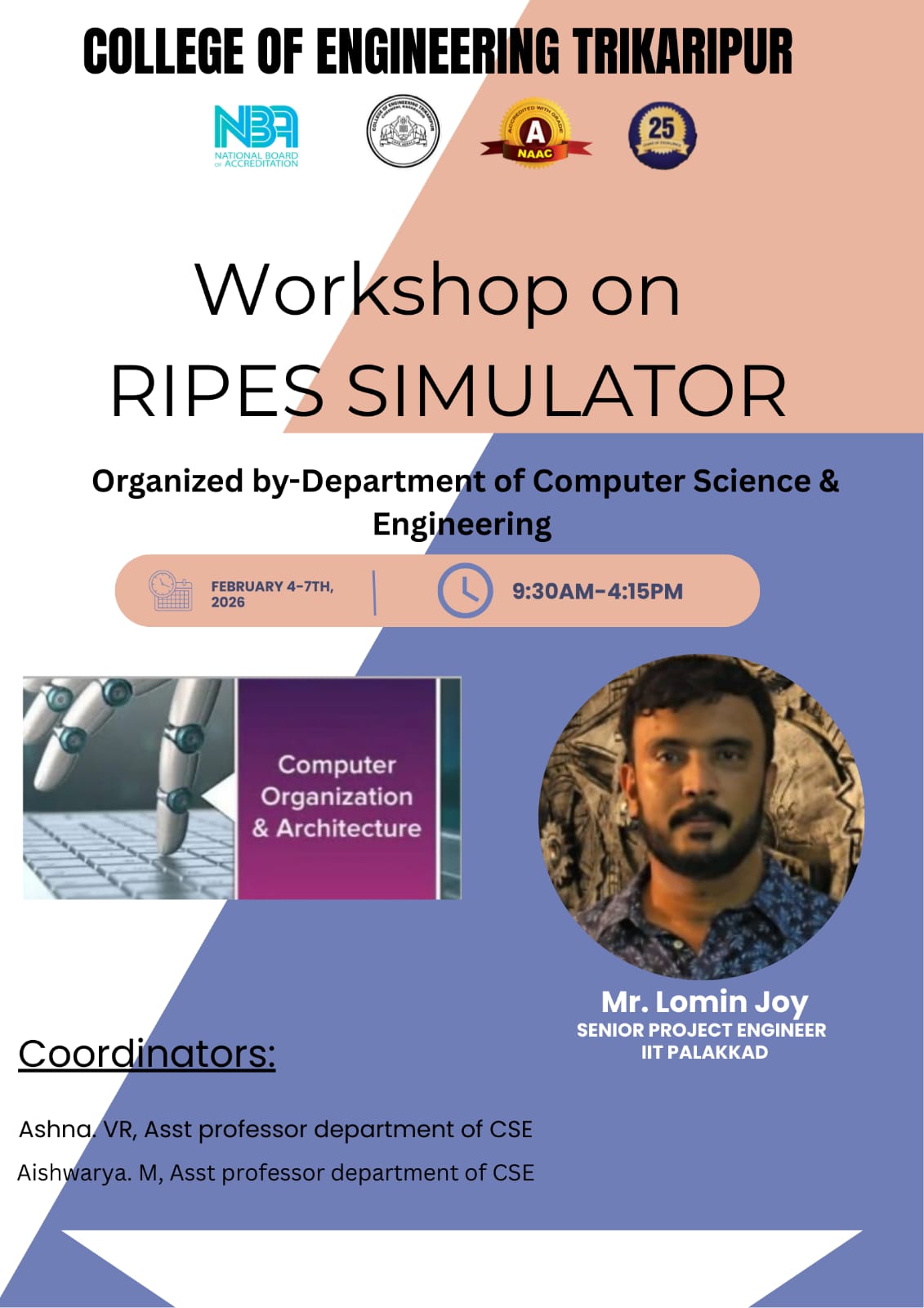 The Department of Computer Science and Engineering emphasizes in nurturing the potential of the students and above all plays a vital role in carving out software intellectuals excelling in innovation, creativity and quality. It is one among the commendable departments in the college. The intake of the B.Tech Computer Science and Engineering programme was increased to 120 with effect from the 2023 admission onwards. In addition, two new undergraduate programmes—B.Tech Computer Science and Engineering (Artificial Intelligence) and B.Tech Computer Science and Engineering (Data Science)—each with an approved intake of 60 students, were introduced from the academic year 2025–26.