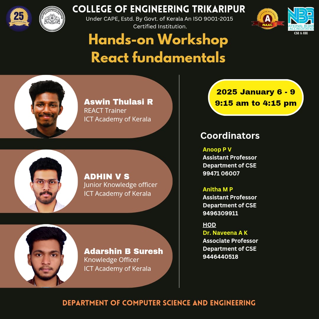 The Department of Computer Science and Engineering emphasizes in nurturing the potential of the students and above all plays a vital role in carving out software intellectuals excelling in innovation, creativity and quality. It is one among the commendable departments in the college. The intake of the B.Tech Computer Science and Engineering programme was increased to 120 with effect from the 2023 admission onwards. In addition, two new undergraduate programmes—B.Tech Computer Science and Engineering (Artificial Intelligence) and B.Tech Computer Science and Engineering (Data Science)—each with an approved intake of 60 students, were introduced from the academic year 2025–26.